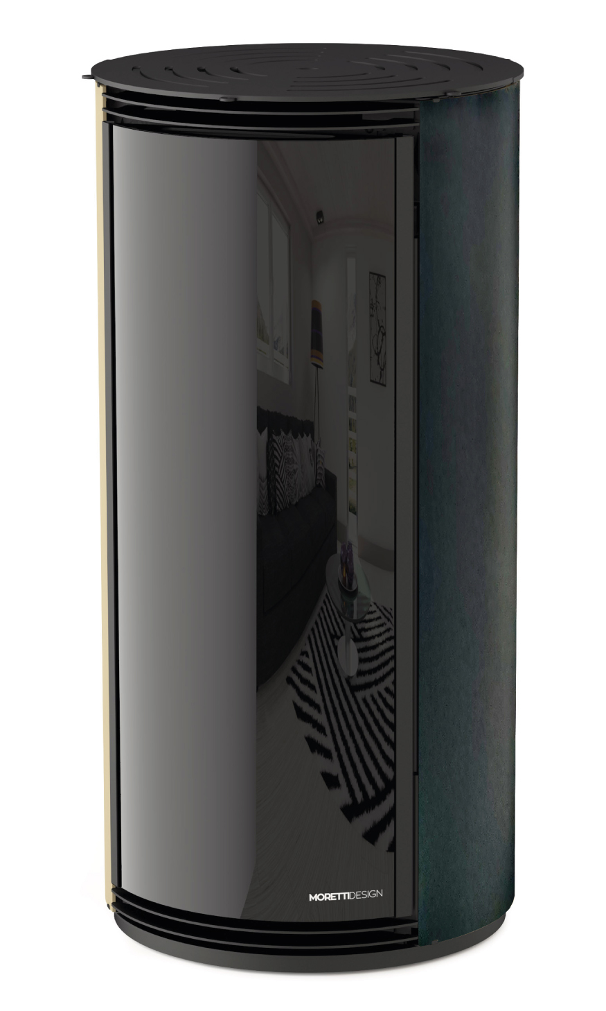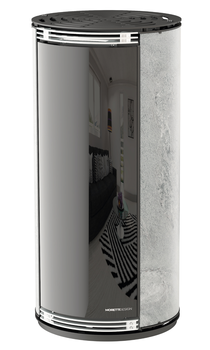 Glass designed and custom-made for all MORETTI DESIGN products, allowing viewing of the combustion chamber only when the flame is lit. The product will also be an exceptional piece of furniture in summer.